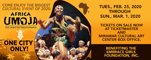AFRICA UMOJA The Spirit of Togetherness a story of the African continent and its unbreakable spirit is set to arrive in South Florida for its one and only USA appearance Tuesday, February 25th through Sunday, March 1st 2020 at the Miramar Cultural Center in celebration of Black History Month. Sponsored by Cox Media Group and Aetna the production is presented by and benefits The Embrace Girls Foundation, Inc.