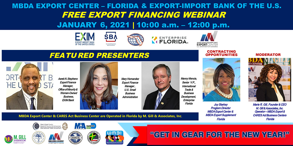 In an effort to help businesses grow and access financing in 2021, the MBDA Export Center – Florida, in partnership with the Export-Import Bank of the United States (EXIM), will present a “Get In Gear for the New Year” Webinar, with a special focus on Financing Domestic and Export businesses projects. The Webinar takes place on Wednesday, January 6, 2021 from 10 a.m. – noon. This event is free of charge, but registration is required.